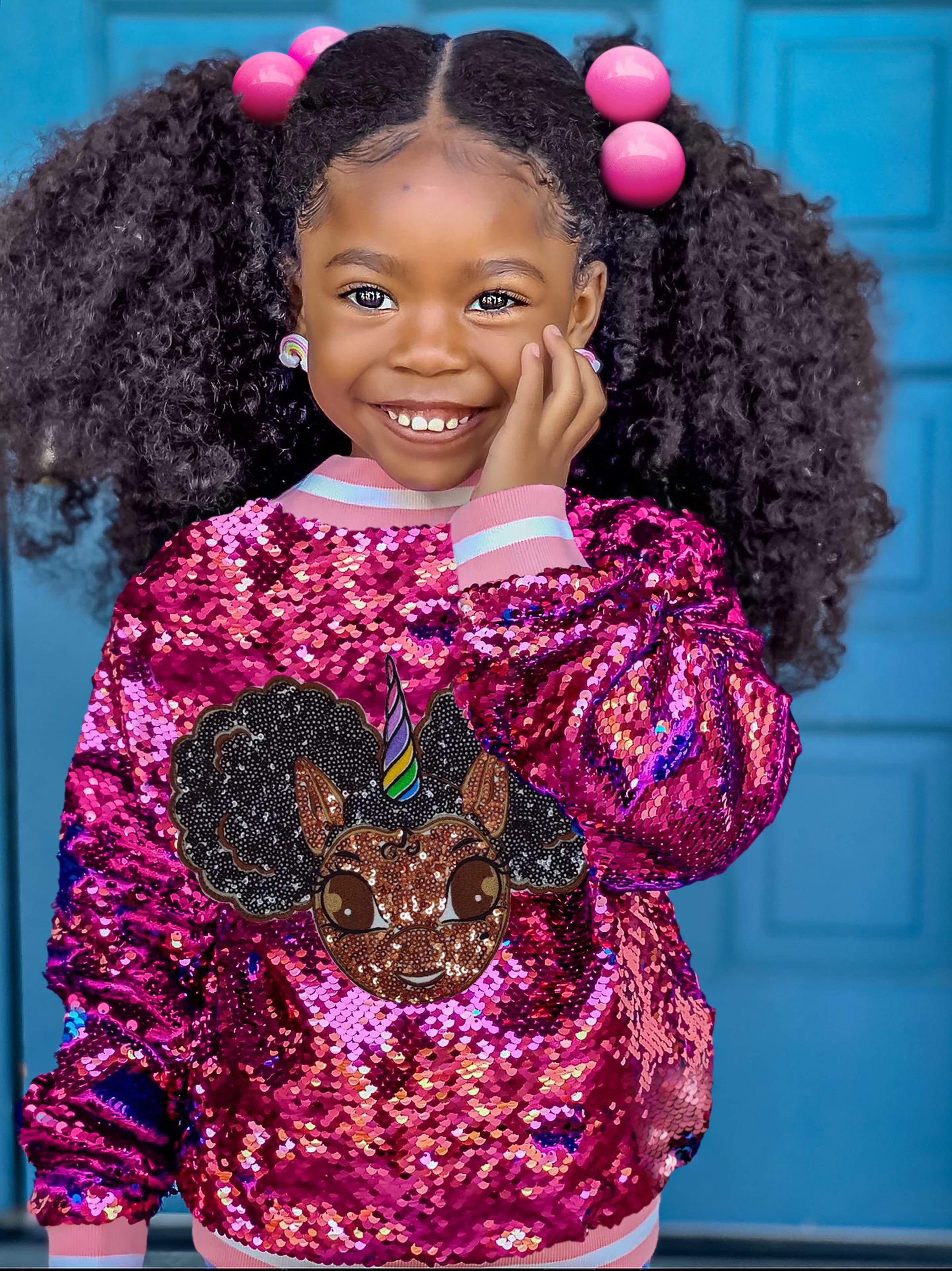 Sequin Jacket with Afro Puff Unicorn Studded Logo Patch - Bubblegum Pink | Berry Blue