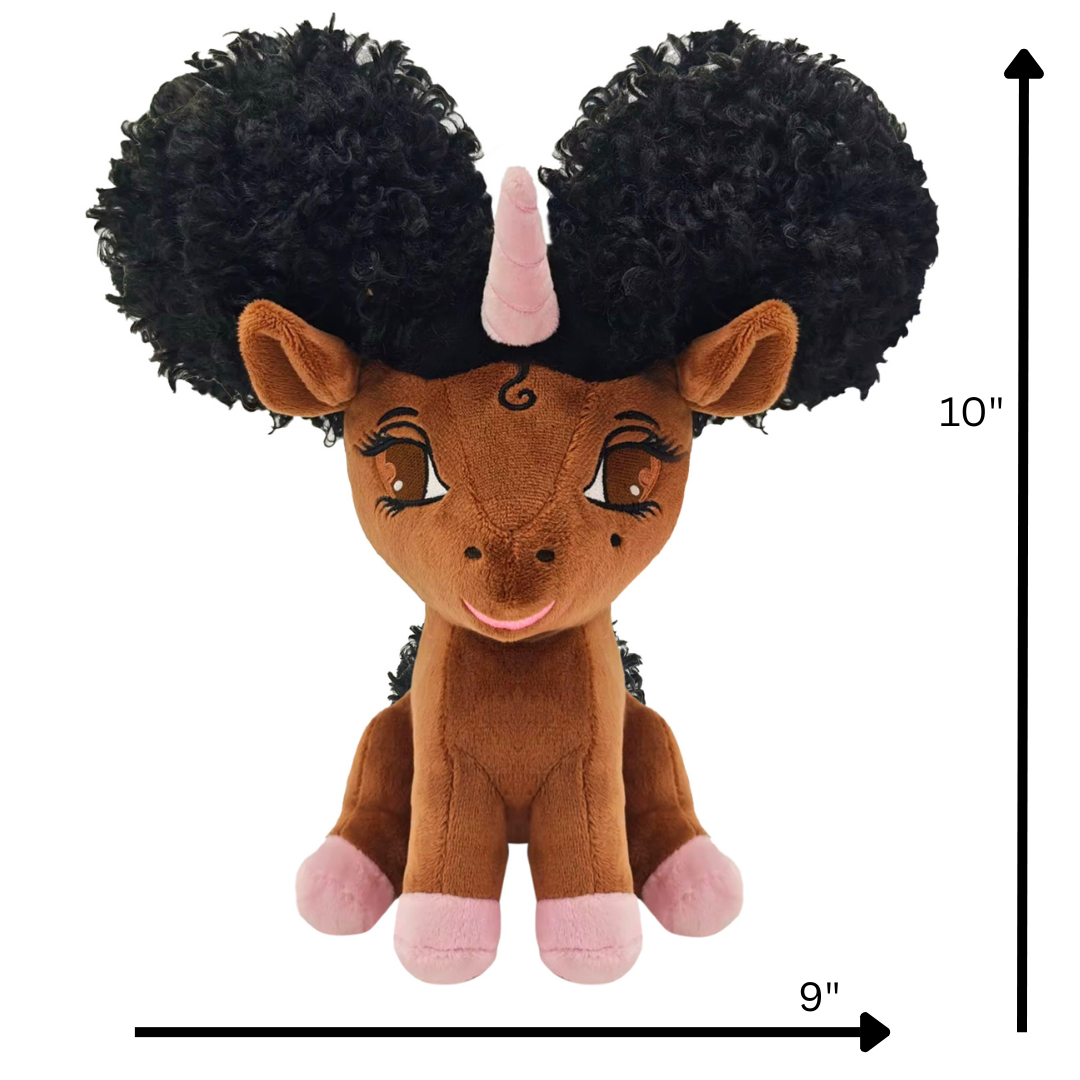 Looking for a new bestie? Meet your new magical companion: this adorable 10-inch Sitting Baby Unicorn, Baby Chloe! Sporting the most beautiful brown afro puffs, this isn't just a toy—it's a little piece of magic ready to fill your heart. The unique afro puff design gives Baby Chloe a special flair, making her an even more charming and distinct friend.  Baby Chloe is the perfect size for endless cuddles and exciting adventures, whether you're off exploring imaginary queendoms or just having a cozy day in. She's truly the ultimate snuggle buddy, always ready to listen to your secrets and dream big dreams with you. More than just a playtime pal, this precious unicorn is a perfect gift for any occasion, sure to spark joy and create unforgettable memories. Get ready for a whole lot of love and laughter with this special friend!