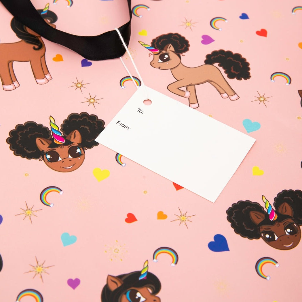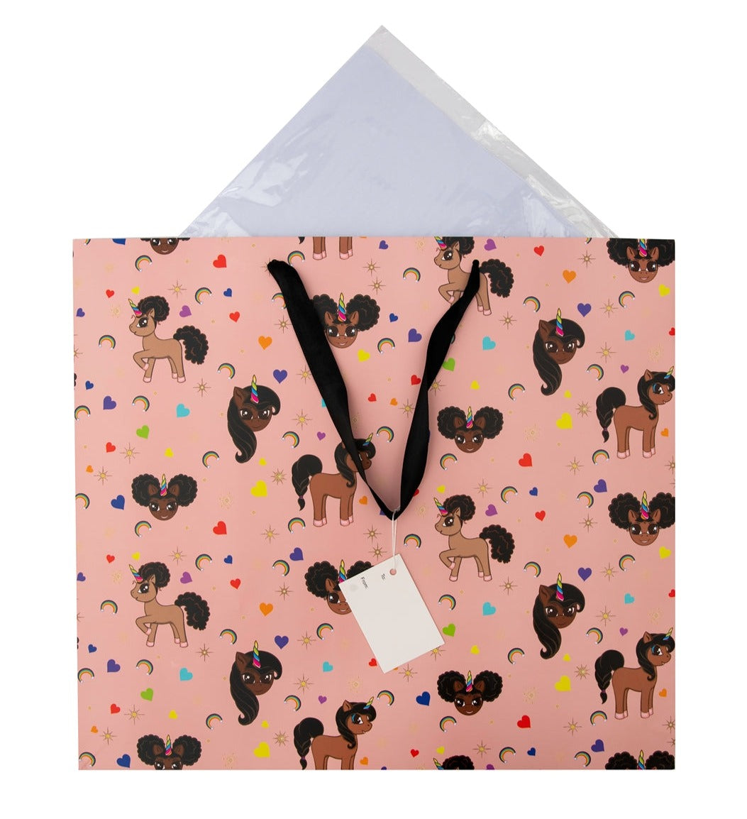 Give someone some Black Unicorn Magic with this beautiful pink gift bag featuring our signature allover print with afro puff unicorns.  This oversized gift bag easily holds multiple gifts like our 16 inch plush, but can also easily handle other toys, books, and more!