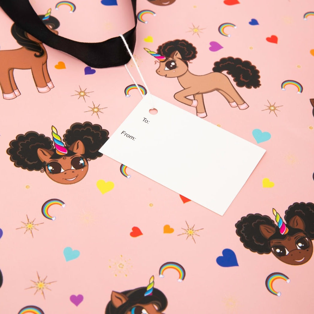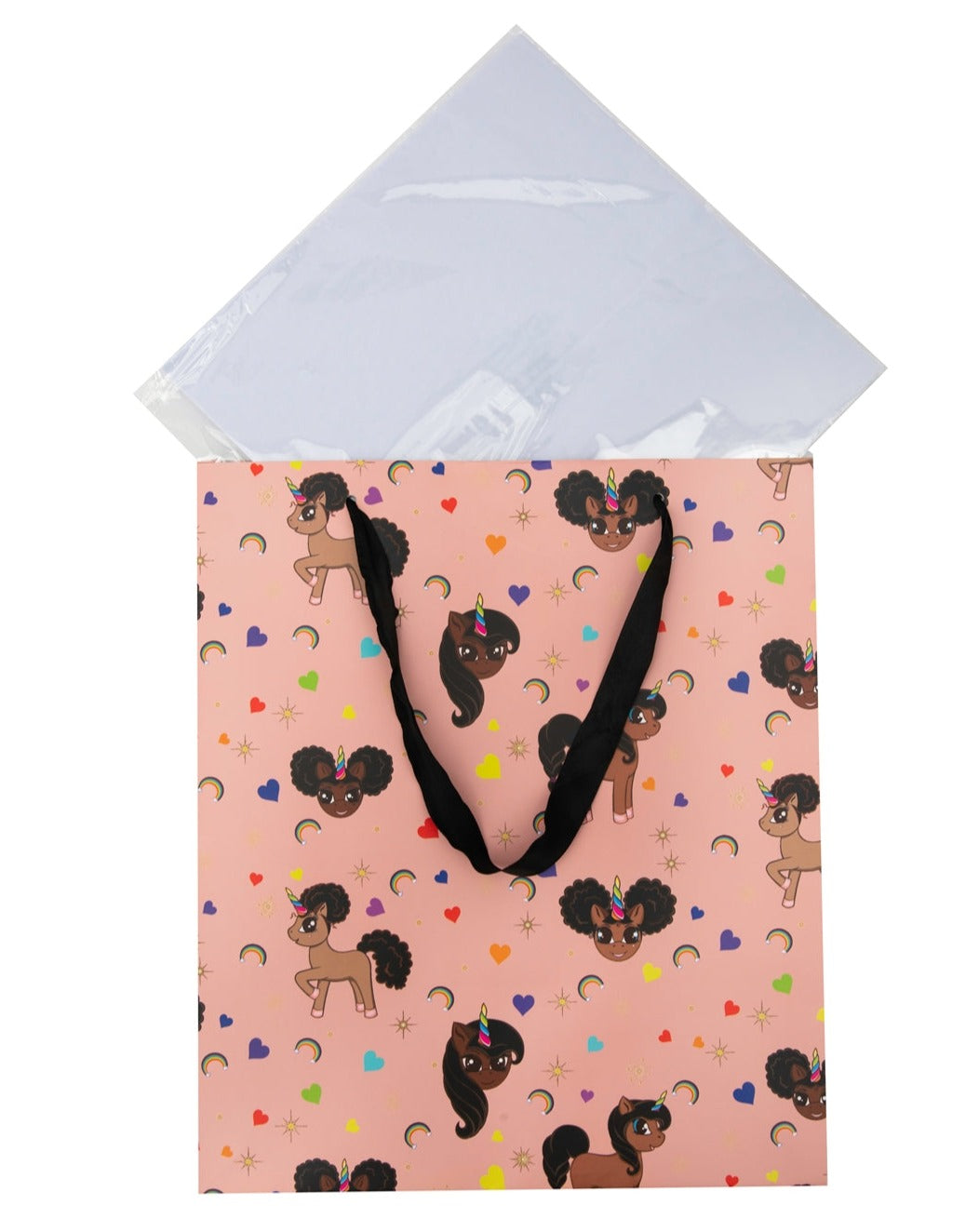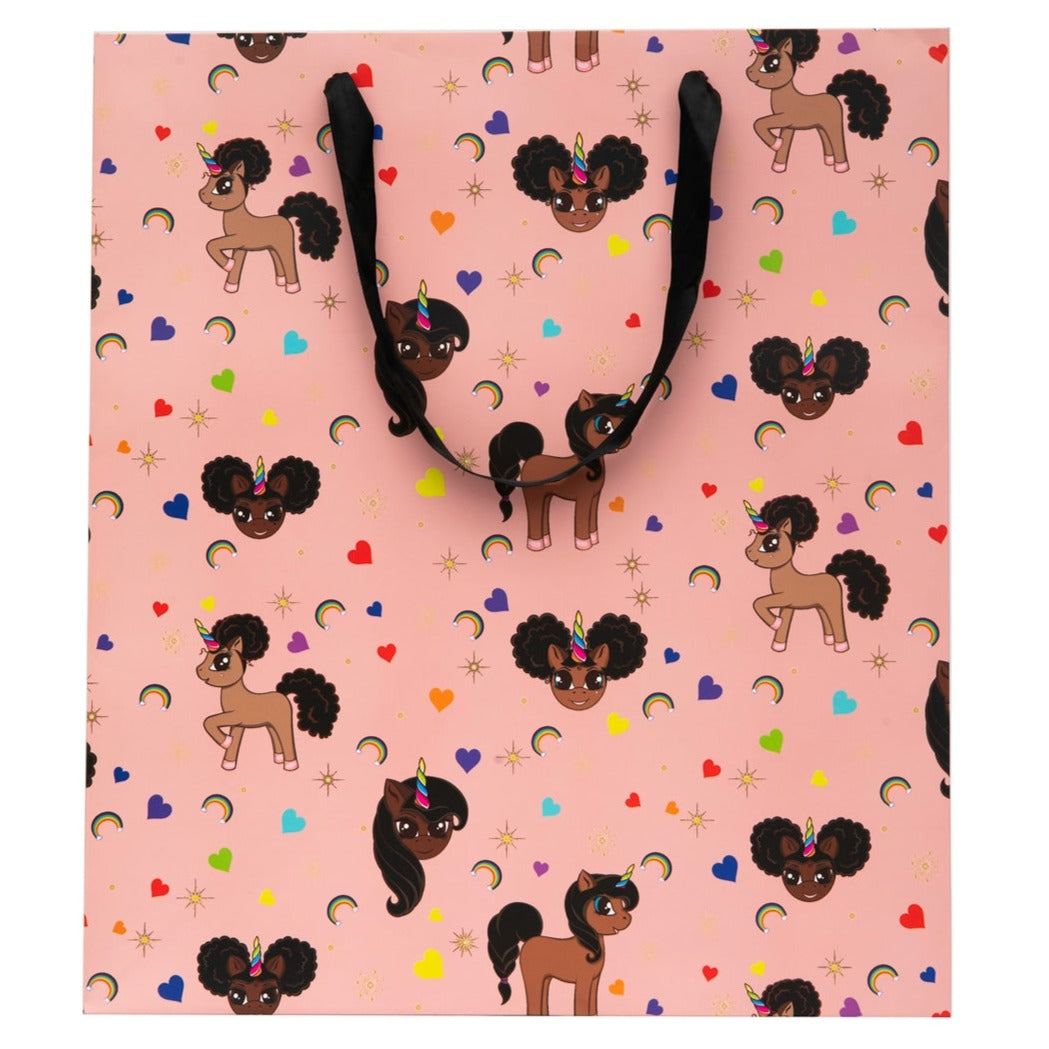 Give someone some Black Unicorn Magic with this beautiful pink gift bag featuring our signature allover print with our afro puff unicorns. This oversized gift bag easily holds  gifts like our 12-14 inch plush, but can also easily handle other toys, books, and more!